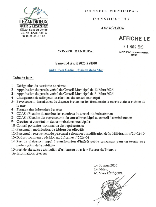 Le Conseil Municipal se réunira le samedi 4 avril 2026 à 9h00,